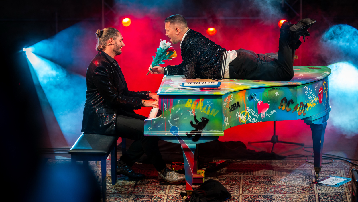 Een Belg en een Duitser stappen samen op één piano af… Klinkt als het begin van een mop — en dat is het eigenlijk ook.